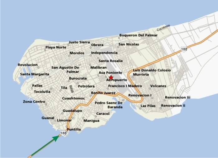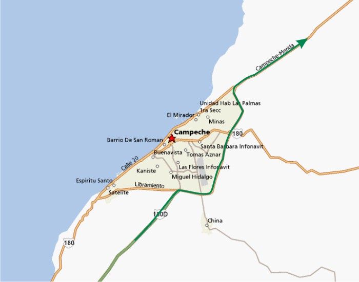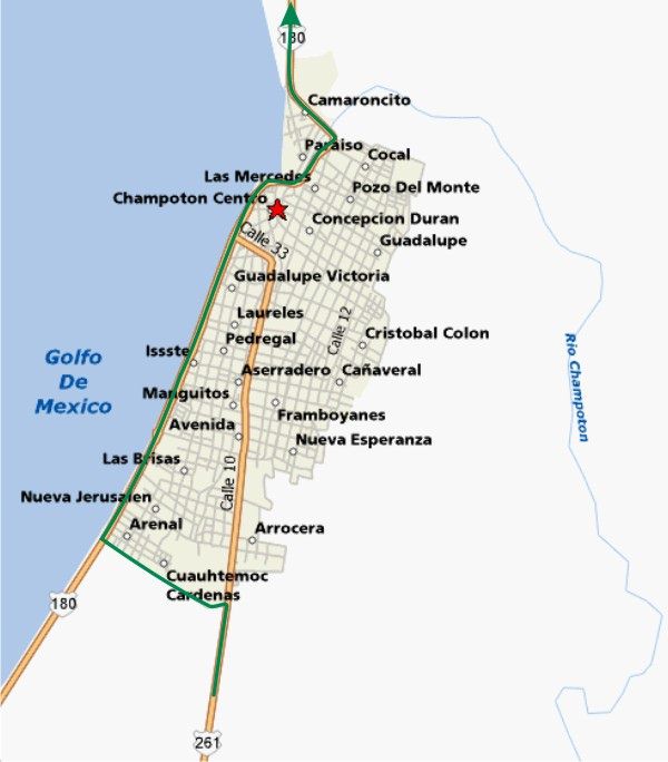 We haven't stopped in Ciudad del Carmen but it looks like it could be an interesting place to explore. Just follow the signs through town to head to Champoton and Campeche. There are a few twists and turns in town, as you can see in the map below, but if you keep your eyes on the signs and follow the general flow of traffic you will have no problems. It is not a huge city, so even if you make a wrong turn you will have no problem getting back on track.