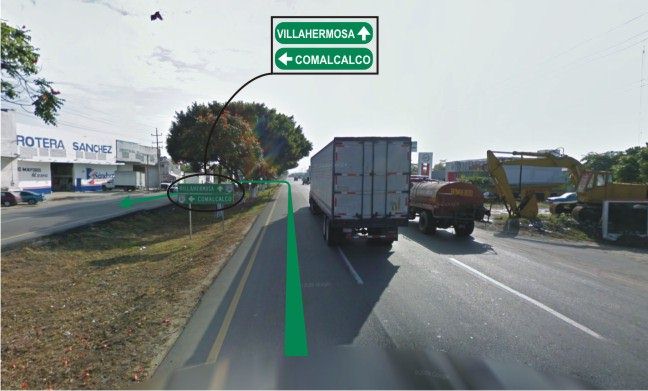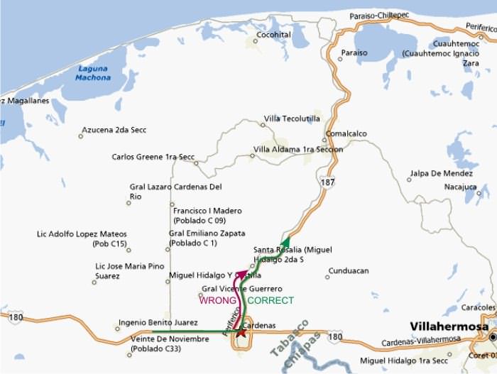 Coastal Route When taking the coastal route, follow the cuota road from Minatitlan towards Villahermosa. About 100 km after leaving Minatitlan there is a city called Cardenas. This is where you will want to turn north to go to Paraiso on Hwy 187. Beware though, there are two Hwy 187's. One is a small road that goes through MANY villages. The one you want is the main and direct Hwy 187 to Paraiso by way of Comalcalco. The small version is the first one you will see, (There is a Pemex station on the right immediately before the wrong road) pass it by and about 4 or 5 kms there will be another exit for 187 north to Paraiso. The last time we took this route we had to pass by 187 and about a couple of KM's later we made a left turn at a retorno and went back to turn right onto 187.( see the picture below for that retorno) If you do end up on the wrong Hwy 187, don't worry. Just grin and bear the topes and then take the first available right turn and you will end up at the intersection where you can turn left to get on the right road.