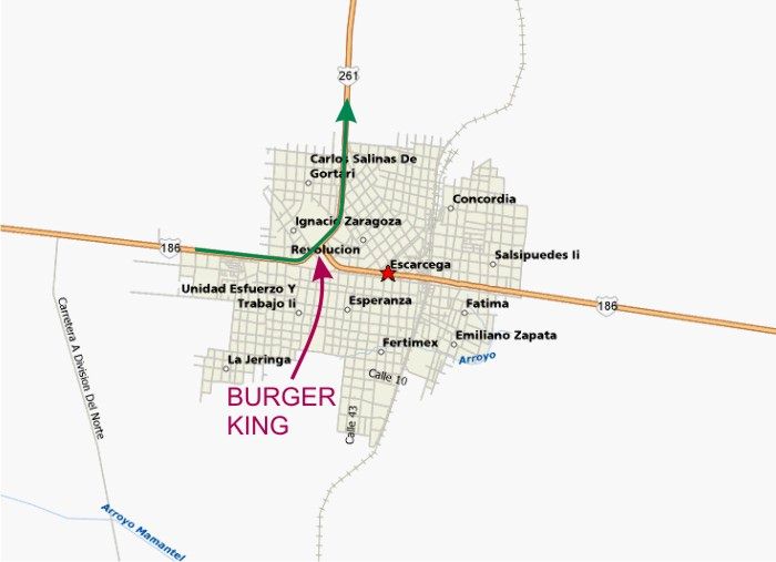 Once you are through Villahermosa it is an easy flat drive to the next main town of Escarcega. Be aware that as you enter and leave Escarcega, the local government felt a need to install a LOT of small but effective topes at each end of town. Just when you think it is safe to speed up DON'T. At the main intersection in town you will be taking Hwy 261 north to Champoton. Also at the main intersection there is a Burger King if you feel a need for some "fast food". If you don't stop, just pass by leaving Burger King on you right. There isn't a real turn involved in Escarcega just follow the main road through a couple of a long sweeping curves to the left.