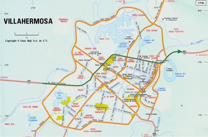 Once through Champoton, refer back to the inland route instructions to continue to Campeche and Merida and Progreso. Below is the description of the route Peter and Linda use to get into Villahermosa and then up to Frontera on the coast. I have added a map of their route though Villahermosa. I always take the Frontera road from Villahermosa. Basically I followed the main drag into the middle of the city and headed north on Avenue Universidad. I took this route because getting into Villahermosa is dead easy and traffic moves very well. I saw no reason to cut north before hitting the city and taking smaller coastal roads and also no reason to go through the city inland to small towns when I could enjoy great scenery along the gulf coast. I found getting through Villahermosa itself to be quick. The approach to the city from the west is very built up with a lot of businesses on either side, but traffic moves very nicely and there are no traffic lights. To get into the city proper you come up over a bridge and it drops you into the city itself. Once over the bridge the road forks… going right puts you on the feeder road that parallels the main through road – traffic on this feeder road is a mess. So stay left/straight. The main through road has a lot of entry exit points from the right and traffic can get jammed up…so drive carefully. If you want to go through the city the safest is to stay in the left lane and avoid the feeder exit/entry points. The beauty of Villahermosa is that the exits don’t appear to be signposted. I guess the locals know where they need to go. So you are pretty much driving by a wing and a prayer. To get to the exit I took (Avenue Universidad) it is best to stay in the right lane and grin and bear the traffic because you might miss it otherwise. Once past the fork it is not far to the Avenue Universidad exit. The easiest way to describe the exit is that you will see what looks to be green space/parkland on your right side. This means that the exit is approaching. The next key is you go over a bridge with water beneath. Take the immediate next right and get in the left lane. There is a traffic light at the bottom of the exit. Turn left and go under the main drag. Ignore the sign at the traffic light that tells you Frontera is straight ahead and not to your left. Once you have made the left turn just keep going. After about 2 miles you will see a steep bridge in front of you. Go over this bridge and keep going. Traffic at this bridge can get a bit congested, so be careful. The road soon opens up into 3 lanes each way and pretty soon you are out of the city and on your way to Frontera. If, heaven forbid, you get totally messed up in Villahermosa and miss the turn have no fear…continue on straight through the city. You will go over a small, but impressive, river bridge. The road curves to the left. Just around the curve is a massive traffic circle. If you stay to the right you will continue on the main road to the east and past the airport. If you stay left then at the far end of the traffic circle you get 2 options. The first exit takes you back into town, the second swings you left on the ‘Perifico’ road which is what you want (I recollect that there may have been a sign saying ‘Perifico’). This perimeter road swings back over another river bridge and meets up with the Frontera road right at the steep bridge described in the previous paragraph. Once out of the city you can make really good time on the road. 60 mph is quite easy. Villahermosa to Merida is about 340 miles. There are hardly any towns and traffic is light. The towns are well signposted and it’s a very easy shot to Merida in about 5 ½ hours. You hit the following towns – Frontera (Pemex), Atasta, Ciudad Del Carmen (Pemex), Isla Aguada (Pemex), Champoton (Pemex) then the Campeche bypass. Atasta is a very interesting town. It is very long and narrow – about 12 KMs. Its claim to fame is that it has 34 topes. So be careful.